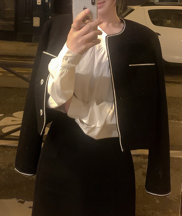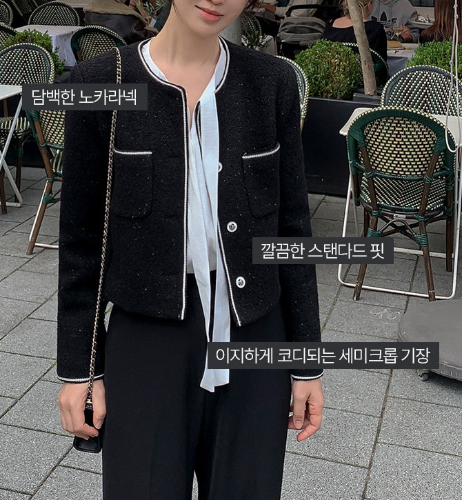 은은한 펄사와 울이 믹스된 트위드 소재로 고급스러운 광택감이 돋보이는 자켓이에요. 모던한 배색 포인트로 세련미를 더했답니다. 담백한 노카라넥과 깔끔한 스탠다드핏으로 단정한 실루엣을 연출해 주며, 세미크롭 기장으로 이지한 코디가 가능해요. 하객룩부터 오피스룩까지 다양하게 활용하기 좋은 아이템입니다.