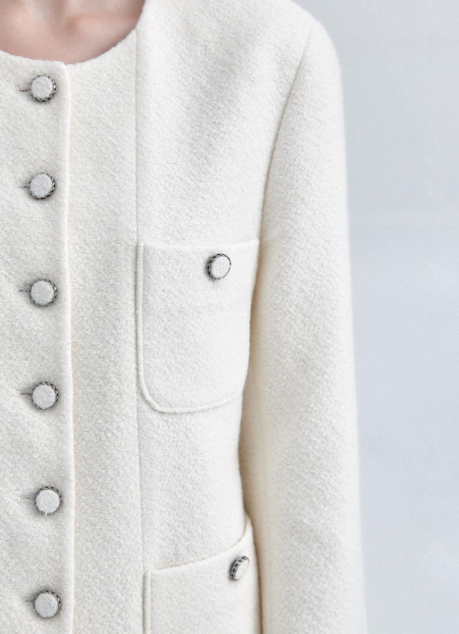 정교한 테일러링으로 완성된 미디 기장의 트위드자켓이에요. 깔끔한 싱글 여밈으로 세련된 무드를 더했답니다. 슬림한 실루엣이 돋보이며, 고급스러운 금속 버튼으로 포인트를 주었어요. 울 혼방의 부클 트위드 소재로 고급스러운 텍스처와 따뜻한 착용감까지 갖췄답니다.