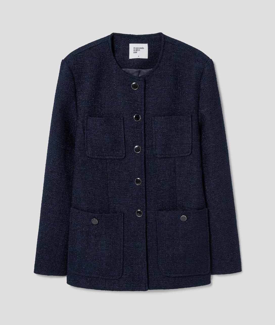 매력적인 텍스처가 돋보이는 트위드 소재로 여성스러운 분위기를 연출해 드리는 에잇세컨드의 재킷이에요. 깔끔한 라운드넥 디자인으로 단아한 무드를 더했답니다. 미디 기장으로 단정하고 세련된 실루엣을 연출할 수 있으며, 실용적인 주머니 디테일로 활용도를 높였어요. 하객룩은 물론 데일리룩으로도 손색없답니다.