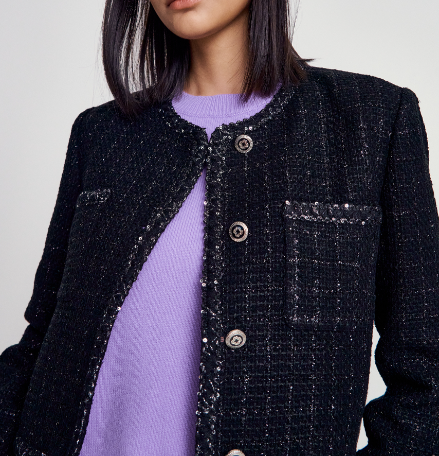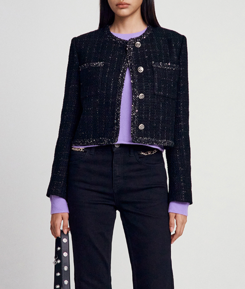 반짝이는 메탈사가 믹스된 트위드 소재가 고급스러운 분위기를 돋보이게 하는 마쥬의 자켓입니다. 클로버가 새겨진 버튼으로 사랑스러운 포인트를 주었답니다. 위쪽에는 2개의 패치 포켓을 더했고, 넥과 포켓, 밑단의 시퀸 믹스 트리밍으로 화사함을 더했어요. 적당히 짧은 기장으로 다양한 하의와 매치하기 좋답니다.