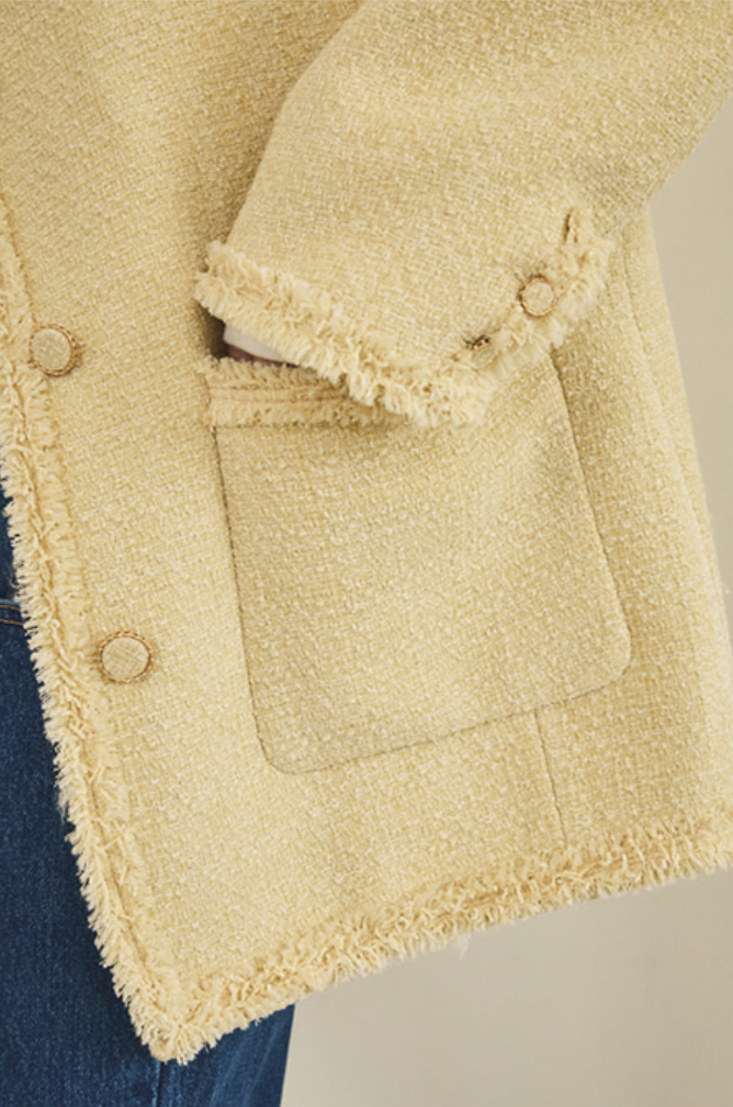 닐바이피의 트위드 자켓은 노란끼 없는 차분한 베이지 컬러로 두께감이 있어 초겨울까지 입을 수 있습니다. 결혼식 하객룩으로 격식을 갖추면서도, 일상에서는 캐주얼한 옷과 매치하여 세련된 룩을 연출할 수 있습니다. 빈티지한 금속 단추가 포인트가 되어, 단순한 옷차림에도 세련미✨를 더해줍니다.