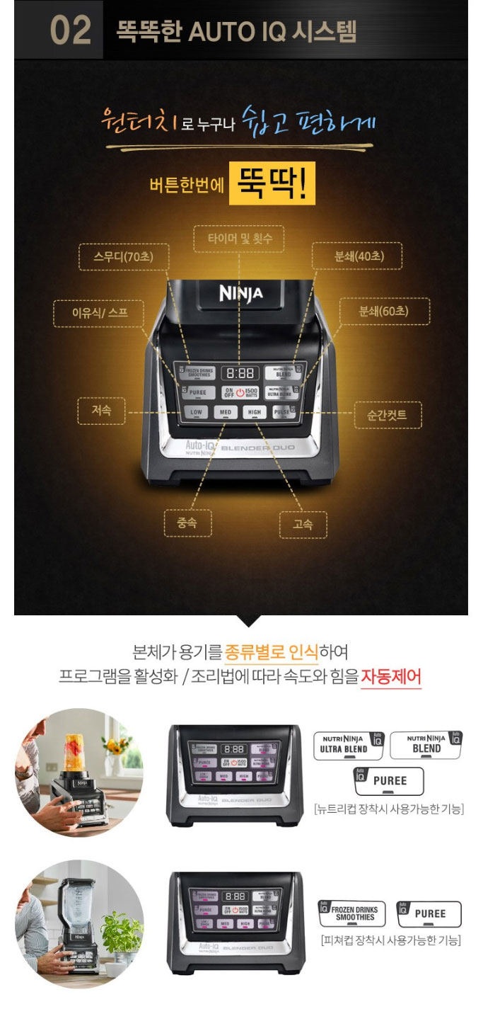 💬 두번째 소개해 드릴 제품은 뉴트리닌자 AUTO IQ 블렌더입니다. 미국 6중 입체 칼날로 단단한 재료, 질긴 재료 모두를 강력하게 분쇄해 주고 다양한 기능이 원터치로 버튼 한번에 작동됩니다. 2마력의 강력한 파워로 재료를 부드럽게 분쇄해 주고 3중 안전 시스템이 갖추어져 있어 안심하고 사용할 수 있습니다. 모터 가열 방지를 위한 오토 쿨링 시스템이 내장돼 있어 과열되는 것을 방지해 줍니다. 색상은 블랙실버 색, 버튼도 미국식 스타일이라 주방을 모던하고 세련되게 연출해 주어 인테리어 효과까지 더해 줍니다.