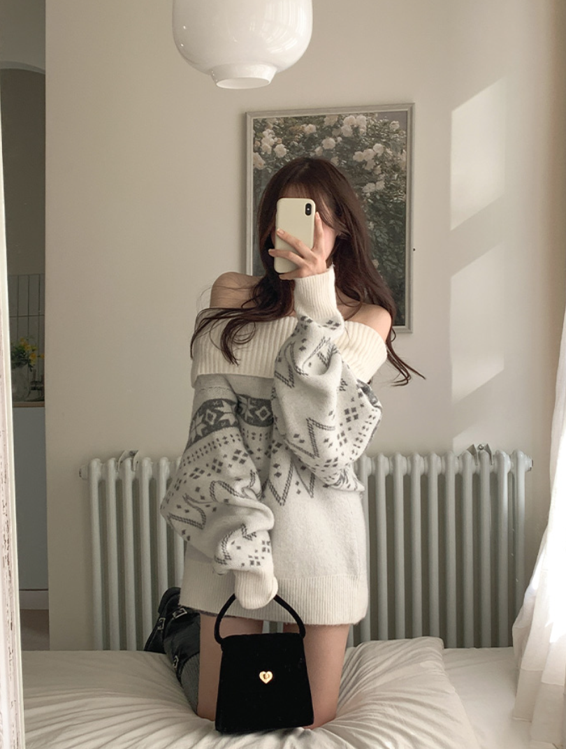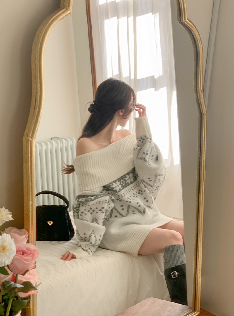 BEST 4. 아뜨랑스 - 오슬로 눈꽃 패턴 루즈핏 오프숄더 롱 니트