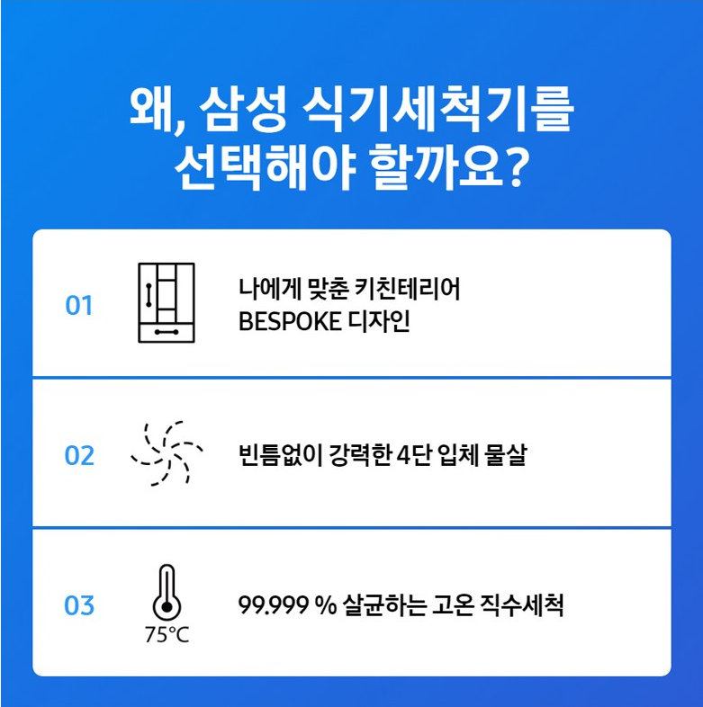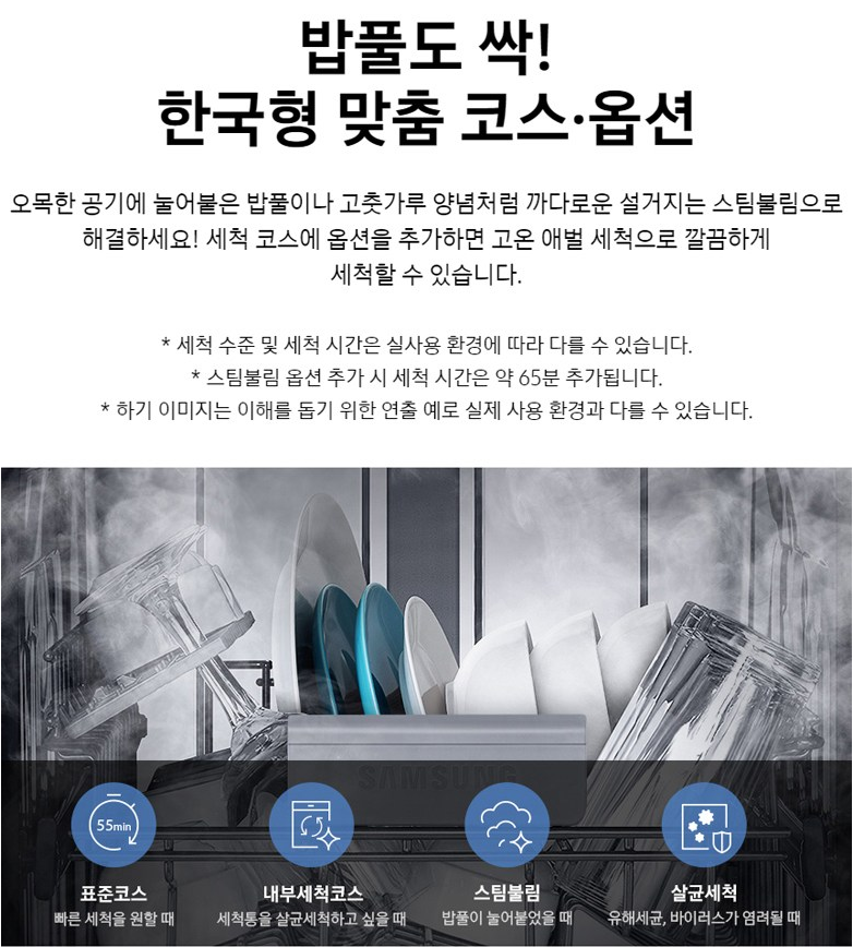 99.9%살균 기능과 4단 입체물살, 한국인 맞춤 코스, 스팀불림옵션, 100℃ 열풍건조, 젖병코스, 수저통 등이 특징인 제품입니다.