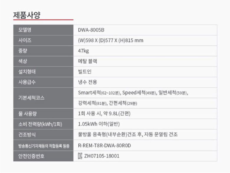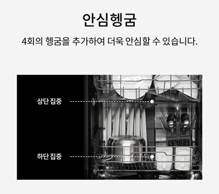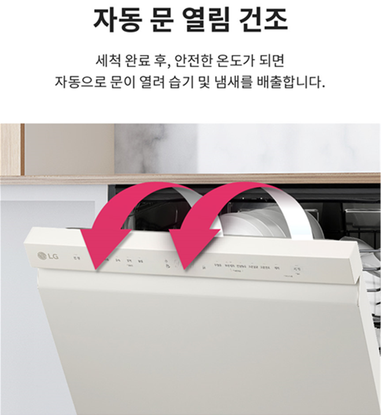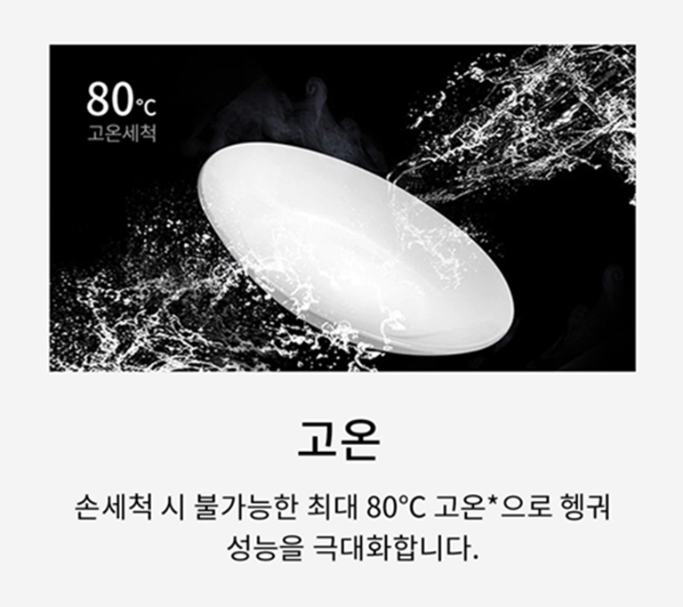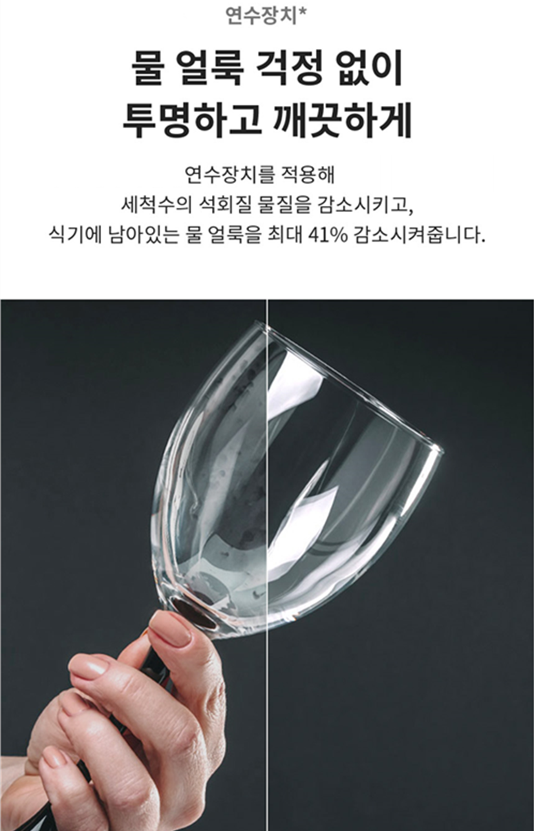 설거지 후에는 물얼룩 자국이 남아 고민인데요. 이 제품은 연수기능을 통해 최대 41%까지 물얼룩을 감소시켜줍니다. 또한 세척 후에는 자동으로 문이 열려 습기와 냄새를 매출합니다. 80도 고온 헹굼기능이 있고 4회까지 헹굼을 추가할 수 있습니다.