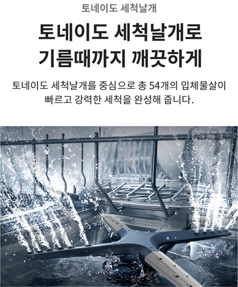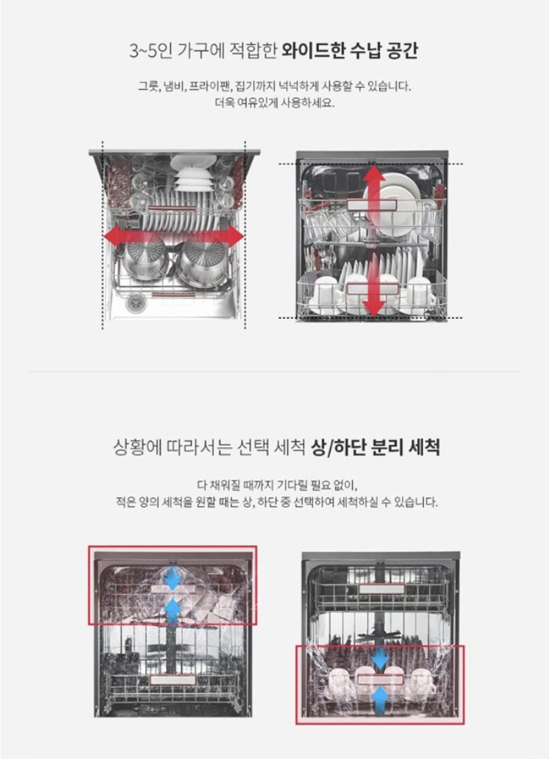 숫가락, 젓가락, 가위 등 자잘한 식기들은 별도의 바구니에 넣어서 편리하게 설거지 할 수 있습니다. 상.하단 분리세척, 85도의 고온 헹굼 기능, 세척완료 후 자동문열림 기능도 있습니다.