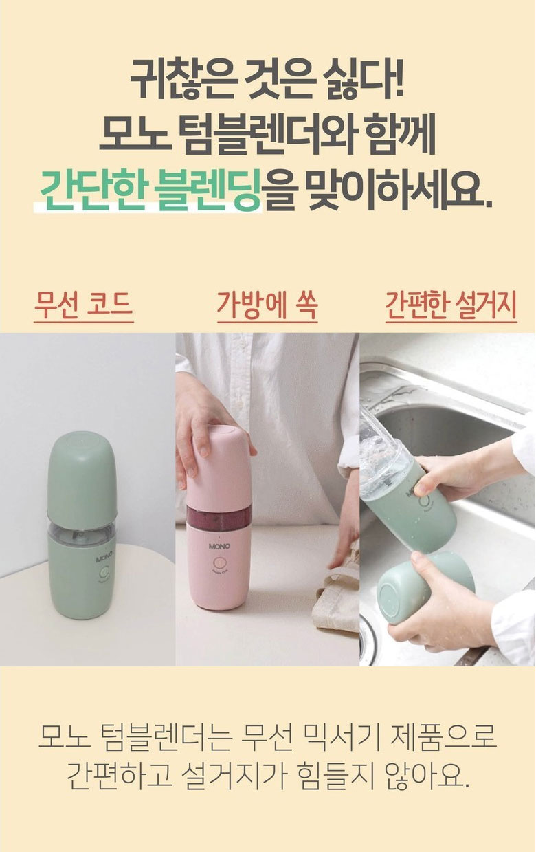 💬 세번째 소개해 드릴 제품은 모노 투고 텀블렌더입니다. 귀찮은 것 싫고 번거로운 거 싫어하시죠? 모노 투고 텀블렌더는 무선방식으로 간편하게 사용할 수 있어 너무 좋습니다. 가방에 쏙 들어가는 컴팩트한 사이즈로 바쁜 아침 과일 주스, 채소주스, 선식 등을 챙겨서 바로 가지고 나갈 수도 있습니다. 한번 충전으로 20잔까지 만들 수 있는 대용량 배터리를 가지고 있는 제품입니다. C타입 충전으로 언제 어디서나 간편하게 충전할 수 있습니다. 제품 앞쪽에는 배터리 잔량을 표시해 주는 부분이 있어 편리합니다. 안전하고 건강하게 믿을 수 있는 제품 모노 투고 텀블렌더로 선택해 보세요. 😃