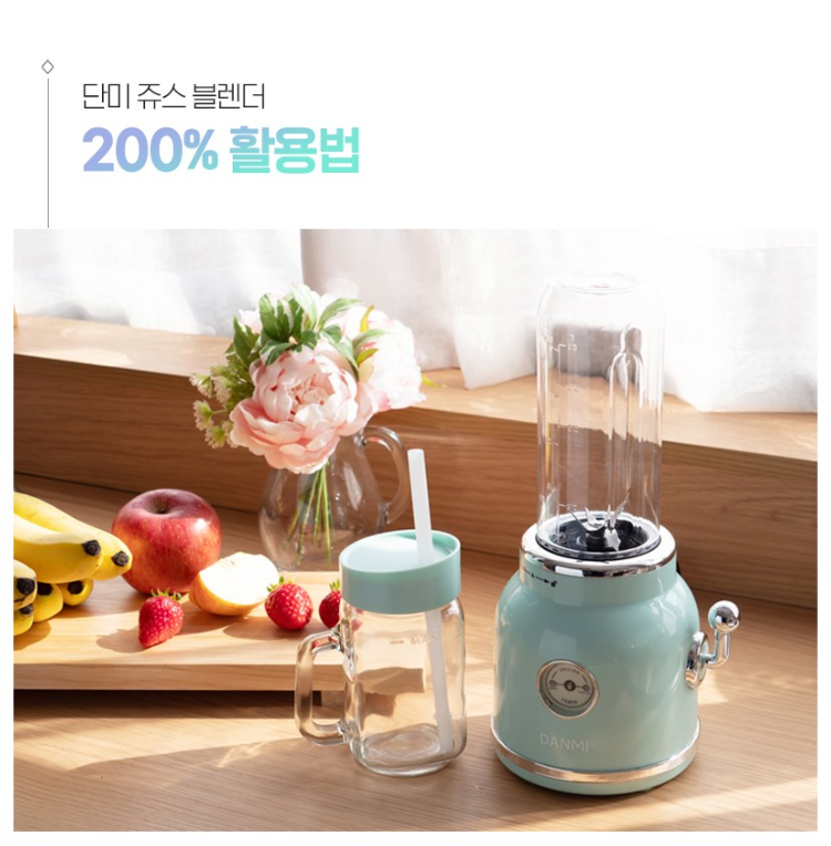 💬 첫번째 추천해 드릴 제품은 단미 미니 블렌더입니다. 이 제품은 작은사이즈에 예쁘고 귀여운 디자인으로 갈아서 바로 마실수도 있고 텀블러에 담아 들고 다닐 수도 있습니다. 레트로한 제품 디자인에 레버를 당겨 제품을 수동으로 동작시켜 쉽고 재미있게 제품을 이용할 수 있습니다. 전용텀블러와 유리컵이 포함되어 있어서 블렌딩 후 바로 마시거나 자유롭게 휴대하기에 좋습니다. 다가오는 여름! 🏝️ 시원한 생과일주스나 제철과일 스무디로 건강을 챙겨보세요~