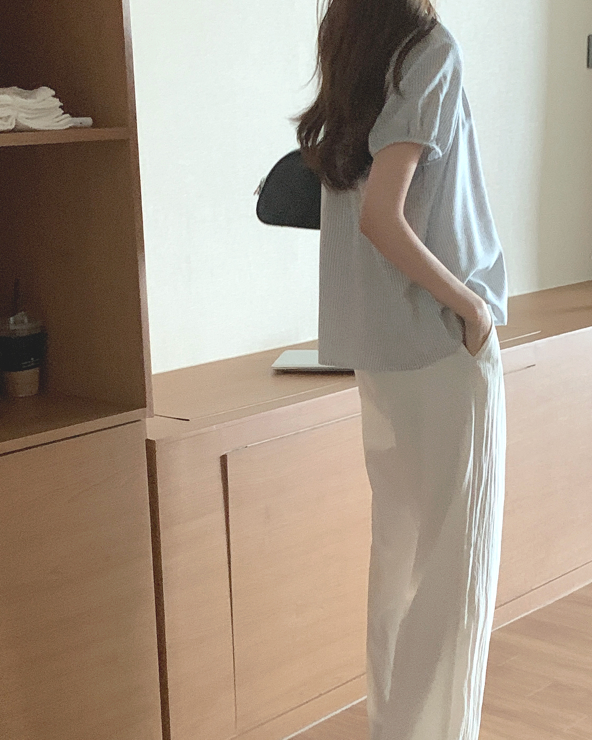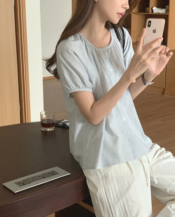 이 블라우스는 데일리한 무드가 가득한 제품이에요. 중앙의 자개 버튼이 귀여운 포인트가 되어주며, 스프라이프 패턴이 밋밋하지 않은 실루엣을 완성해 줍니다. 적당히 파인 라운드 넥 라인으로 일상에서도 편안하게 착용할 수 있고, 어깨선이 없는 래글런 디자인은 자연스럽고 내추럴한 어깨 라인을 연출해 줍니다. 골반을 충분히 덮는 기장으로 자연스러운 인 아웃 스타일링이 가능해요.