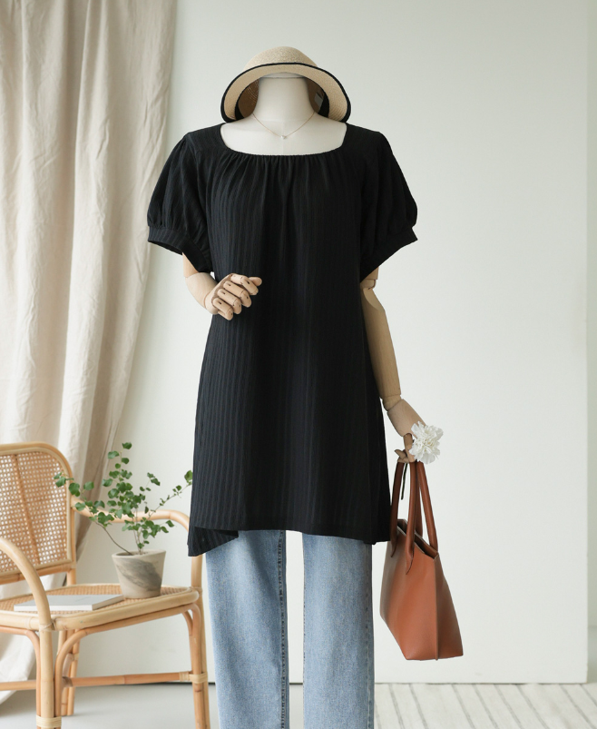 잔잔한 셔링 디테일이 러블리한 분위기를 완성한 롱 블라우스예요. 탱글한 스판 블렌드 원단이 쿨하고 편안한 착용감을 선사합니다. 둥근 스퀘어 넥라인에 셔링을 더해 여성스러움을 강조하고, 사랑스러운 퍼프소매 디자인이 매력을 더했어요. A라인 핏과 허리 사이드 스트랩으로 체형을 자연스럽게 커버할 수 있어 부담 없이 입을 수 있어요.
