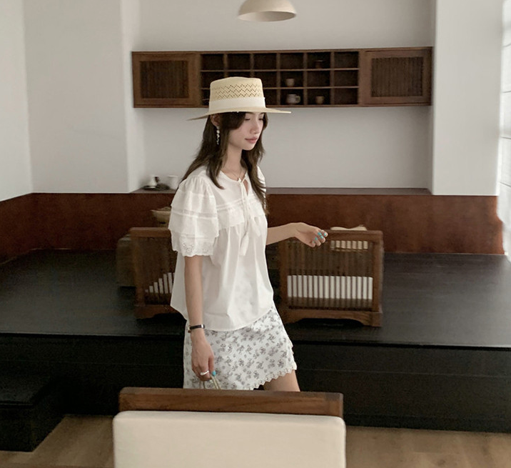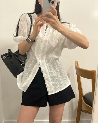 빈티지하고 퓨어한 매력의 반팔 코튼 블라우스입니다. 레이스 디테일과 우드 버튼이 더해져 로맨틱한 분위기를 자아내며, 소매는 여리여리한 퍼프 디자인으로 포인트를 줬어요. 편안하고 여유 있는 핏과 힙을 살짝 덮는 기장감이 매력적입니다.