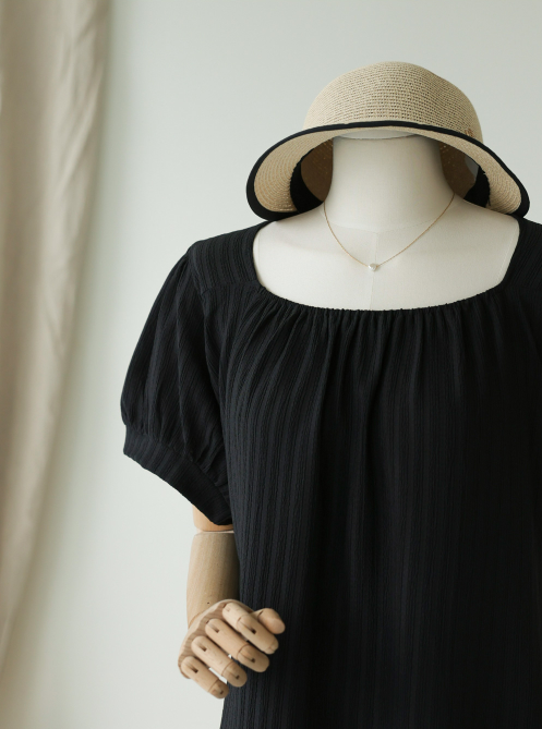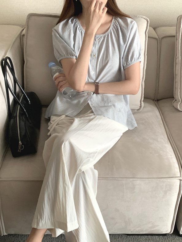 적당히 텐션 있는 코튼 혼방 원단을 사용했고 밀도 있고 가벼운 두께감으로 깔끔한 착용감을 줍니다. 오픈된 네크라인과 양 사이드의 스트랩은 매듭을 짓거나 풀어 포인트를 줄 수 있는 활용성 좋은 스타일링을 가능하게 합니다. 숄더 라인을 따라 셔링 디테일을 더해 푹신한 퍼프 소매가 돋보이는 디자인입니다.