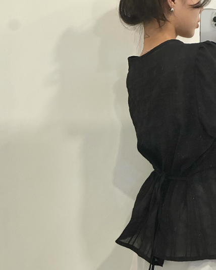 여성스러운 느낌의 블라우스로 여름시즌 가볍게 입기 좋은 반팔 블라우스입니다. 허리라인에 스트랩이 있어 뒤로 묶을 수 있습니다. 은은한 비침이 있고 쇄골라인도 약간 드러나는 디자인입니다. 몸에 붙지 않고 시원한 소재로 되어 있어 한여름에 입기 좋은 반팔 블라우스입니다. 특히 골반 아래로 내려오는 길이감이 부담스럽지 않아 데일리로 착용하기 좋을 것 같습니다.