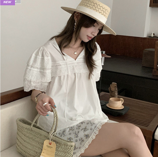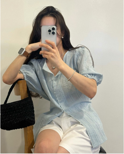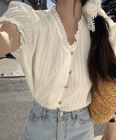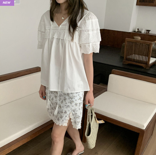 Best4. 모코블링 - 코튼레이스 퍼프반팔 블라우스