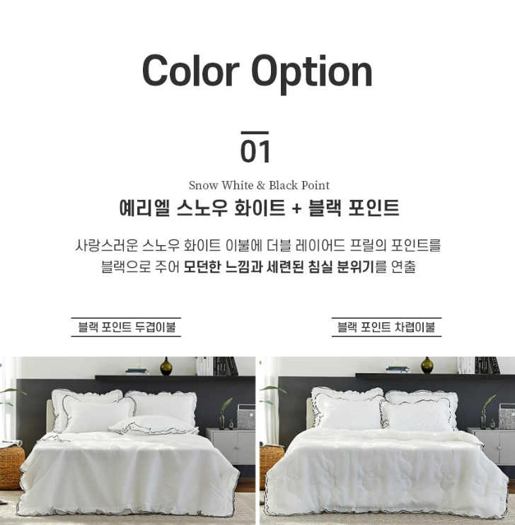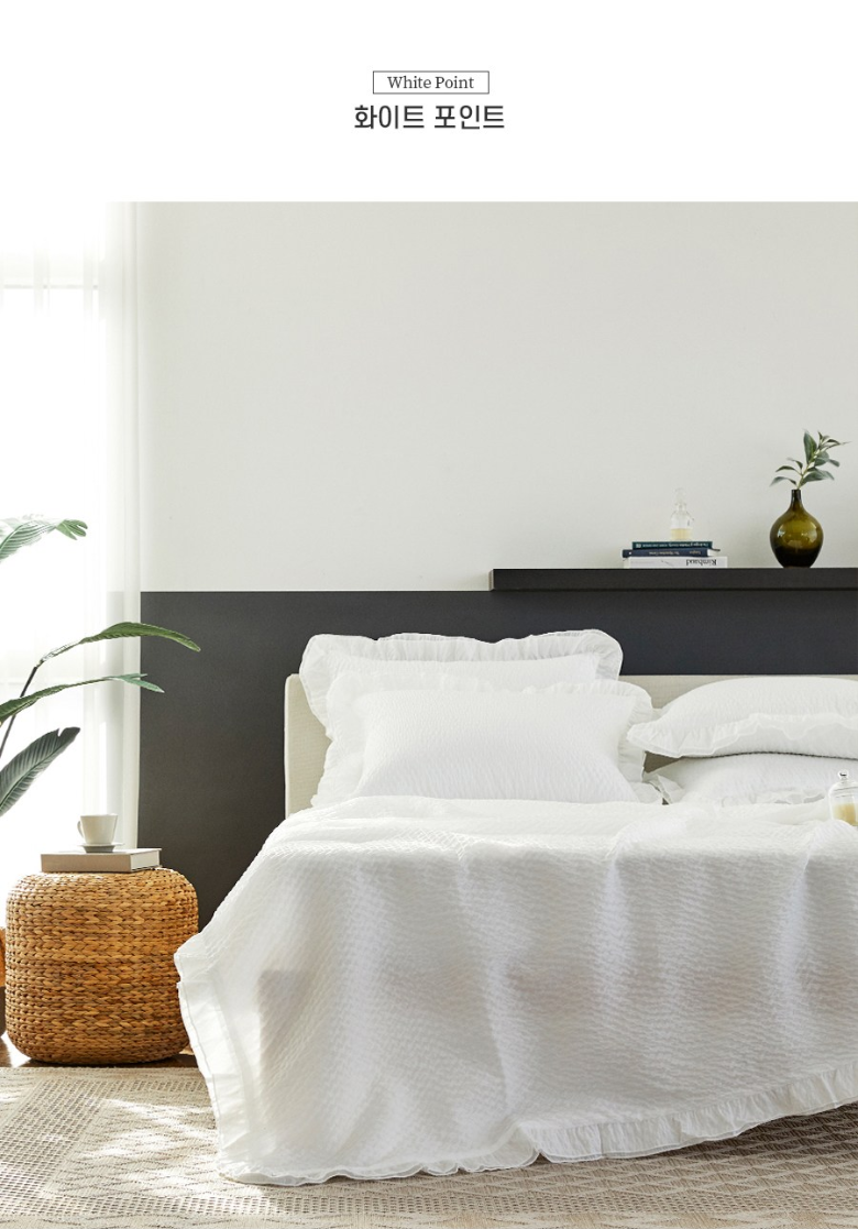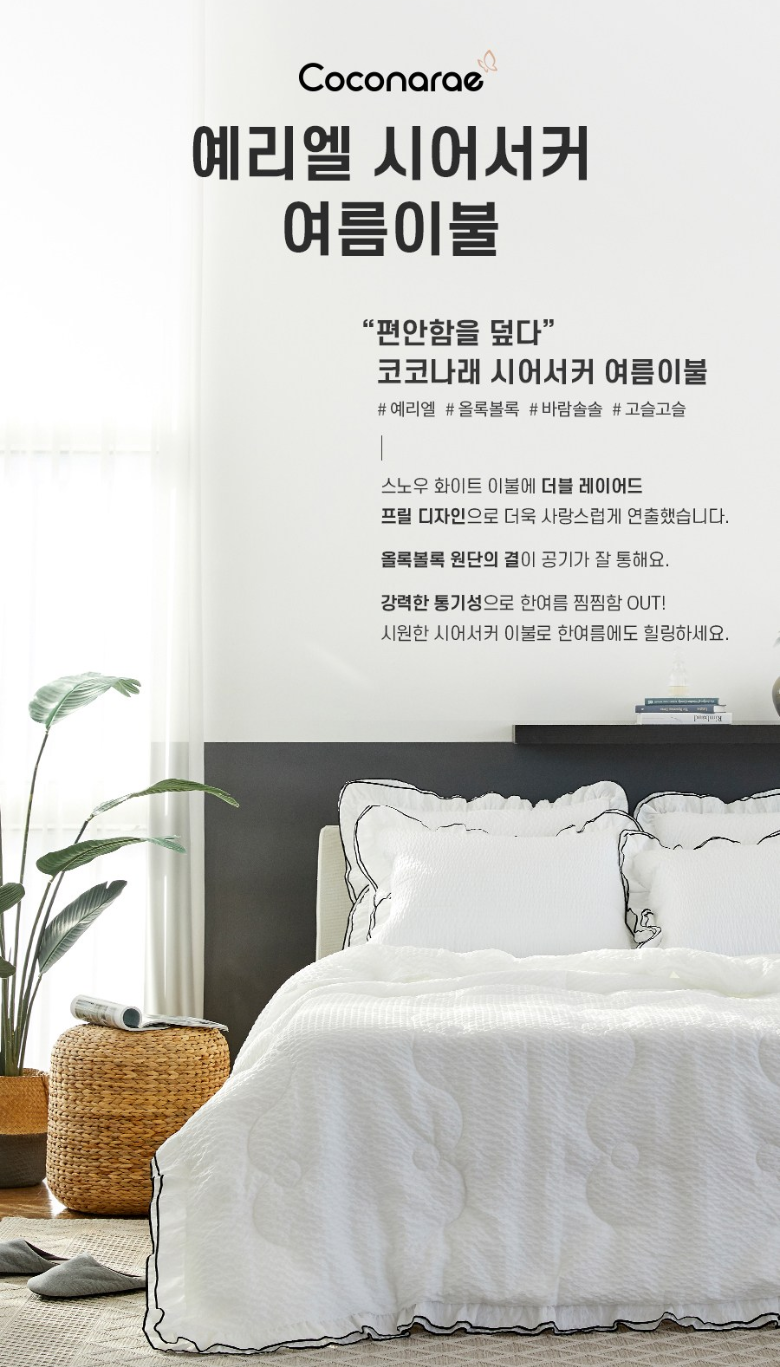 💬 네번째로 소개해 드릴 제품은 코코나래 예리엘 더블프릴 윙 시어서커 세트입니다. 이 제품은 국내산 시어서커 리플원단으로 몸에 닿는 부분을 시원하고 쾌적하게 해주고 더위를 많이 타는 분들에게 잘맞는 침구입니다. 이불 촉감이 시원하면서 부들부들해서 보송보송 꿀잠 예약입니다. 스노우 화이트 이불에 프릴 디자인을 더해서 사랑스러운 분위기를 연출할 수 있습니다.