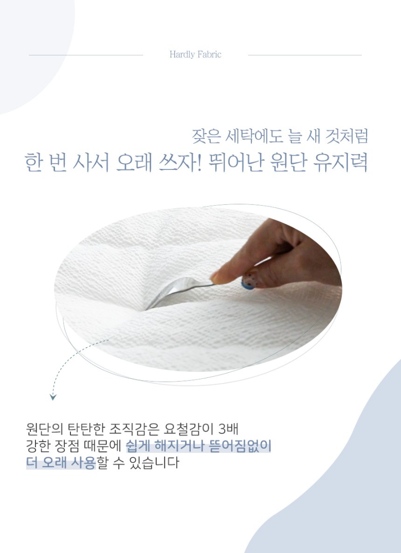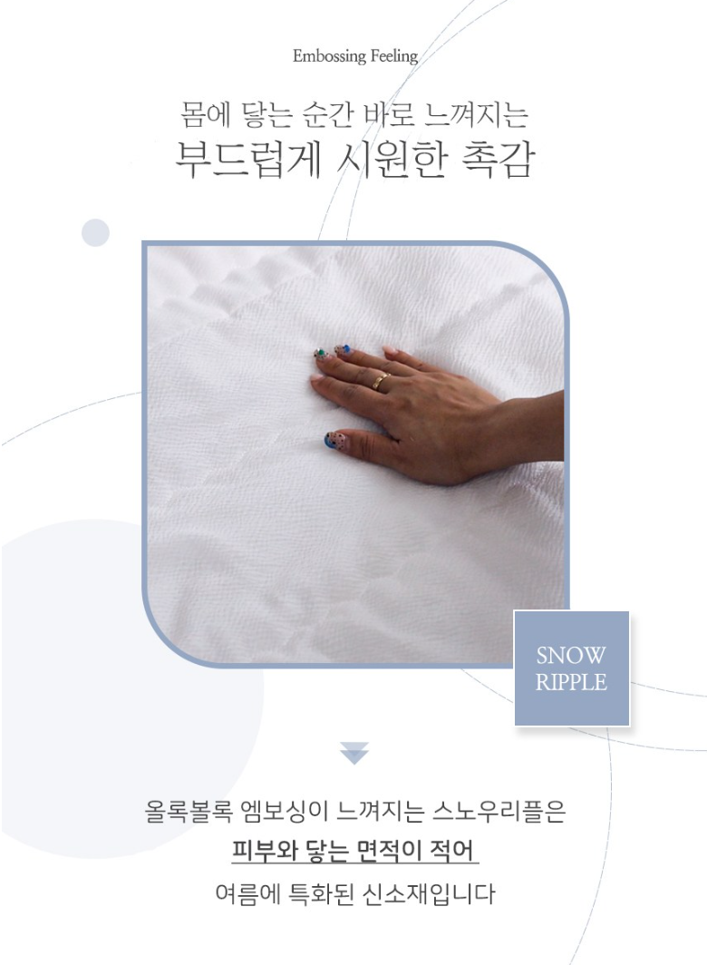 💬 마지막으로 소개할 제품은 해밀홈 신소재 스노우리플 차렵이불 패드세트입니다. 사진보다 실물이 더 예쁜 화이트 색상으로 소재도 부드럽고 몽글몽글한 느낌입니다. 신소재 스노우리플을 사용하여 몸에 닿는 순간 부드럽고 시원한 촉감이 바로 느껴집니다. 올록볼록 엠보싱으로 피부에 닿는 면적이 적어 여름에 최적화된 상품입니다. 원단의 탄탄한 조직감으로 잦은 세탁에도 새것처럼 예쁘게 사용할 수 있습니다.
