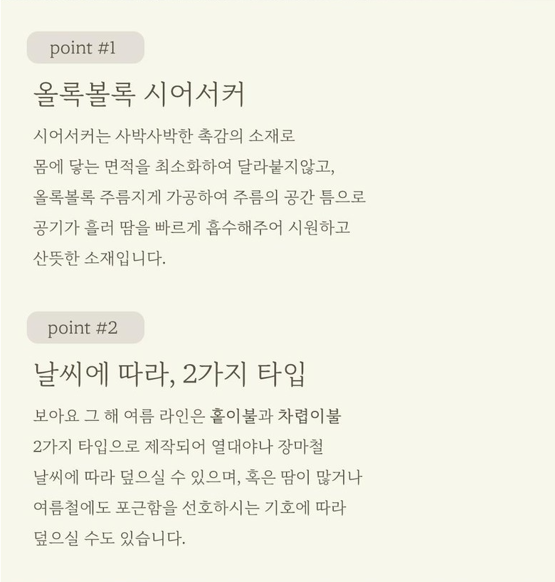 린넨이나 모달 같은 소재의 한 종류가 아니라 굵기, 장력, 꼬임 등 성질이 다른 두 종류의 원사를 인정한 간격에 맞춰 가공하는 방식을 말하며, 원단을 수축하는 정도에 따라 경사 방향으로 무늬가 생기는 것이 특징입니다. 이렇게 하면 원단이 피부에 닿는 면적이 적어져서 바람이 잘 통하고 시원해집니다. 이런 가공방법에 린넨, 모달같은 시원한 소재를 사용하면 한결 더 시원한 원단을 만들 수 있습니다. 세탁을 해도 금세 마르고 원래 주름이 있는 소재여서 다림질도 필요없는 것이 장점입니다.