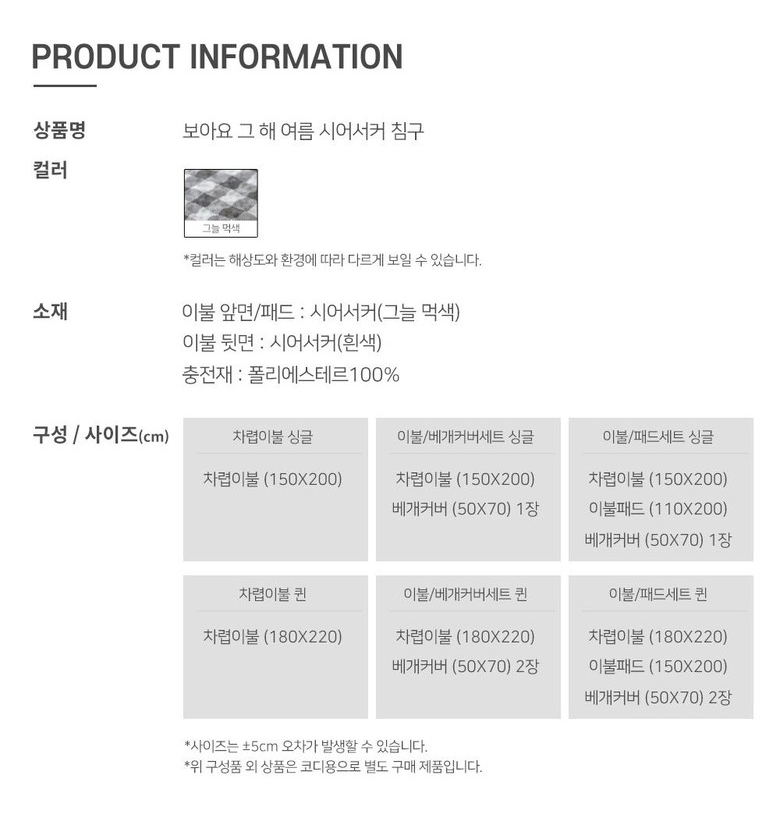 보아요 시어서커 여름 체크 이불+패드+베개세트 |