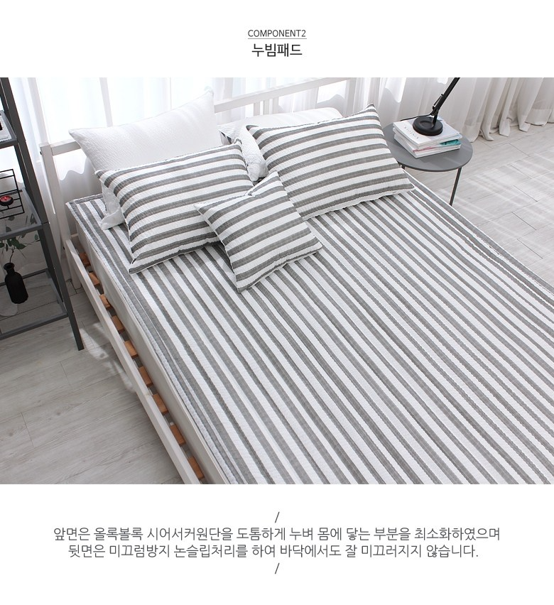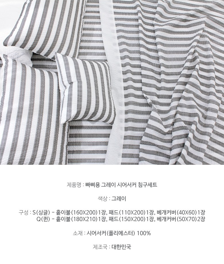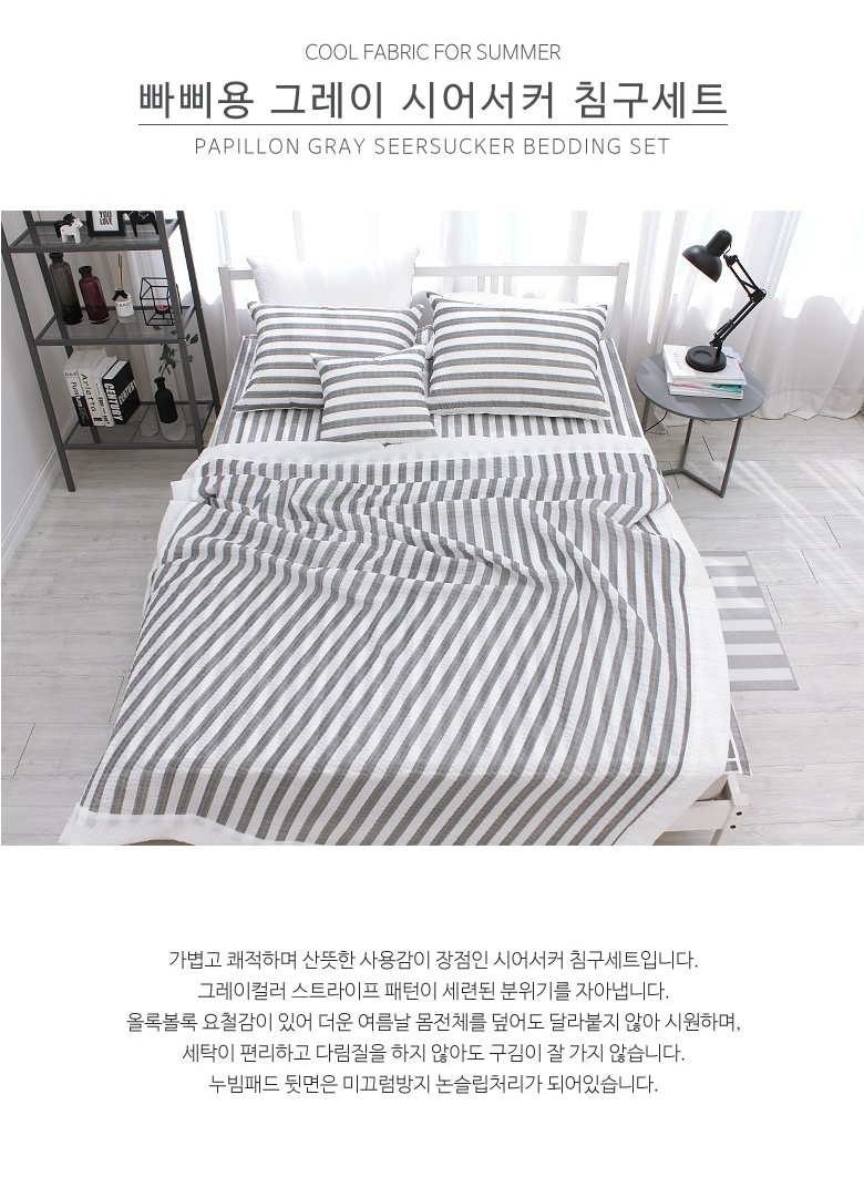 💬 세번째 추천드릴 제품은 슈에뜨룸 빠삐용 시어서커 침구세트입니다. 여름철 대표원단인 시어서커를 사용해 주름사이 공기층으로 통기성이 우수하고 세탁도 편리합니다. 그레이컬러 스트라이프 패턴이 침실을 세련된 분위기로 연출해 줍니다. 홑이불이라 몸전체를 덮어도 달라붙지 않고 시원하며 가볍고 부피가 작아서 여름에 덮기에 제격인 제품입니다.