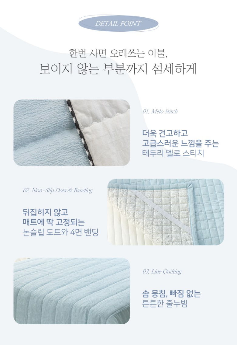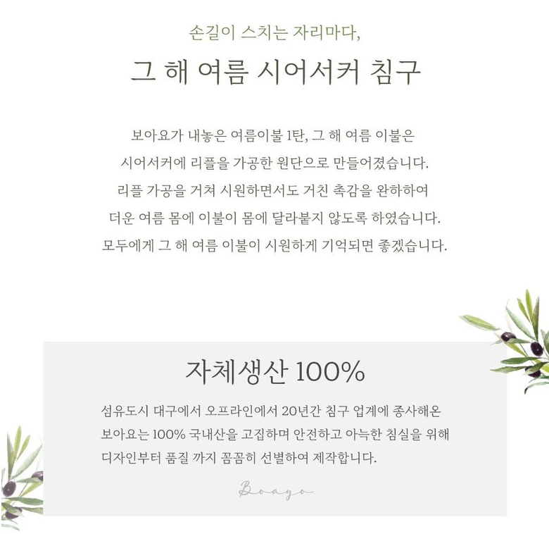 💬 첫번째 추천드릴 제품은 체크무늬가 매력적인 보아요의 시어서커 여름체크 이불세트입니다. 100% 국내생산으로 안심하고 사용할 수 있는 제품입니다. 보아요의 '그해여름'라인은 홑이불과 차렵이불 두가지 타입이 있으며 올록볼록 시어서커 소재를 사용하여 피부에 닿는 면적을 최소화하고 땀을 빨리 흡수시켜 줍니다. 패드에는 미끄럼방지와 고정밴드처리가 되어 있어 편리합니다.