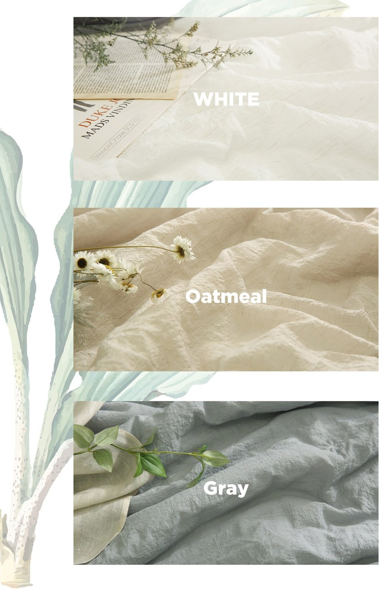 마 식물 원료로 촉감이 가슬가슬해서 피부에 달라붙지 않아 시원합니다. 땀 흡수가 잘 되고 바람이 잘 통해 여름용 소재로 많이 사용됩니다. 구김이 잘 생긴다는 단점이 있어 세탁망에 넣어 섬유유연제 없이 울코스로 빨래하는 것이 좋습니다. 내추럴한 무드의 침실을 원한다면 이만한 소재가 없습니다. 린넨을 침구로 고를 땐 100% 린넨보다는 면과 혼방된 린넨코튼을 추천합니다. ˁ ˈ ᵕ ˈ ˀ♡