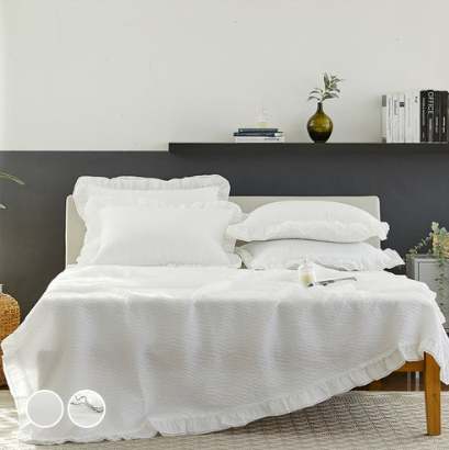 💬 네번째로 소개해 드릴 제품은 코코나래 예리엘 더블프릴 윙 시어서커 세트입니다. 이 제품은 국내산 시어서커 리플원단으로 몸에 닿는 부분을 시원하고 쾌적하게 해주고 더위를 많이 타는 분들에게 잘맞는 침구입니다. 이불 촉감이 시원하면서 부들부들해서 보송보송 꿀잠 예약입니다. 스노우 화이트 이불에 프릴 디자인을 더해서 사랑스러운 분위기를 연출할 수 있습니다.