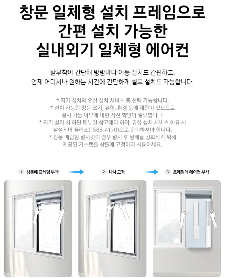 - 창문 일체형 설치 프레임으로 간편 설치, 실내외기 일체형 에어컨, 창턱 두께 제약없는 설치