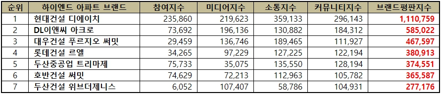 한국기업평판연구소에서 빅데이터를 분석해 하이앤드 아파트 브랜드에 대해 평판조사를 실시했습니다. 2023년 4월~5월까지의 국내 하이엔드 아파트 브랜드 빅데이터 3,561,604개를 분석해 조사하였으며, 참여가치, 소통가치, 소셜가치, 시장가치, 재무가치로 나누어 분석하였습니다. 여기서 하이앤드란 기존의 가치보다 더 새롭고 한 단계 높은 최고급이라는 의미입니다. 그럼 결과를 살펴보겠습니다.